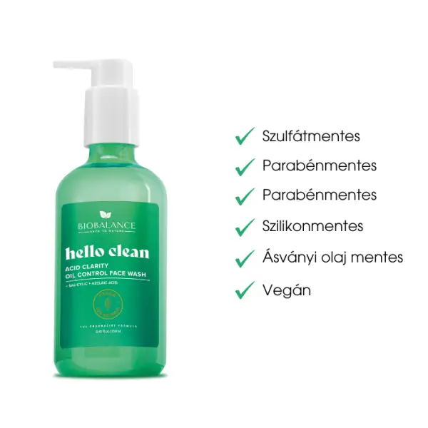 Hello Clean faggyútermelést szabályozó arclemosó gél. 95%-ban természetes eredetű összetevőket tartalmaz.