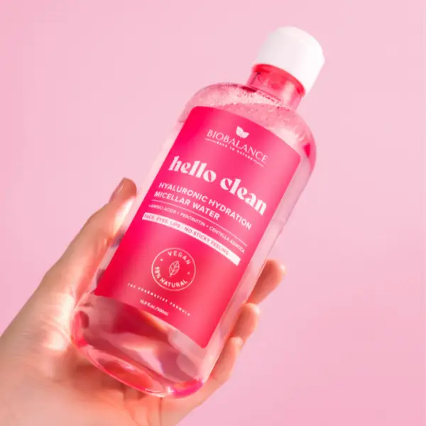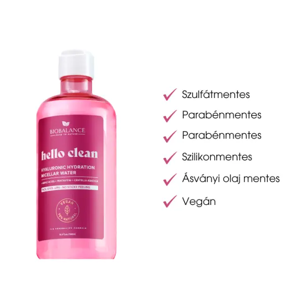 Hello Clean hidratáló micellás víz hialuronsavval. 98%-ban természetes eredetű összetevőket tartalmaz.